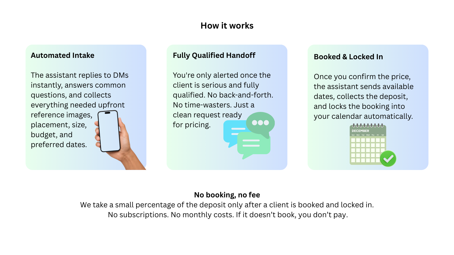 We only earn once the client is booked, has paid their deposit, and is locked into your calendar.